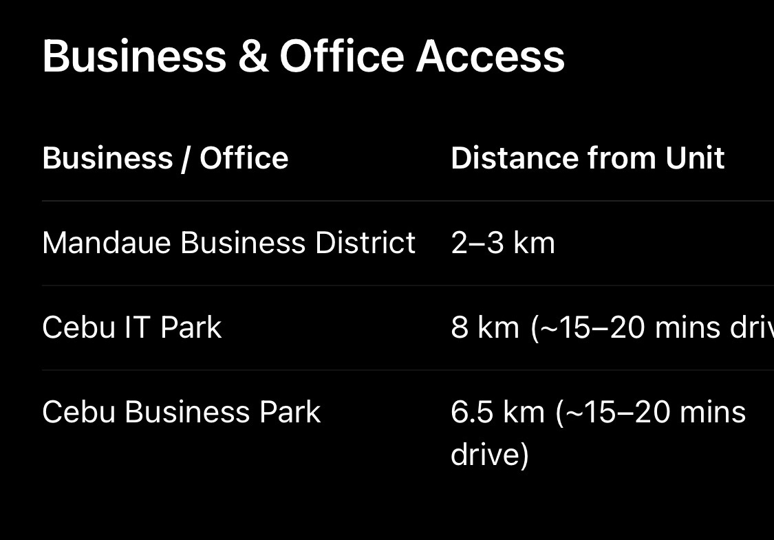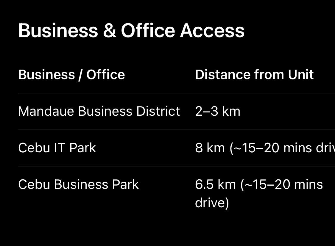 - Cebu Business Park – 6.5 km (~15–20 mins drive)