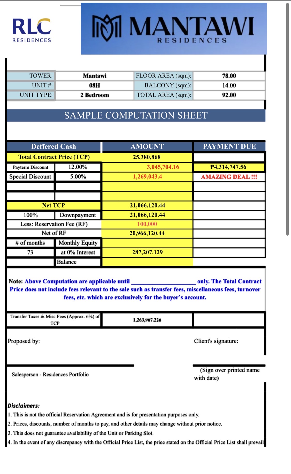 This is a 2-bedroom unit, 92 sqm in total (78 sqm floor area + 14 sqm balcony).