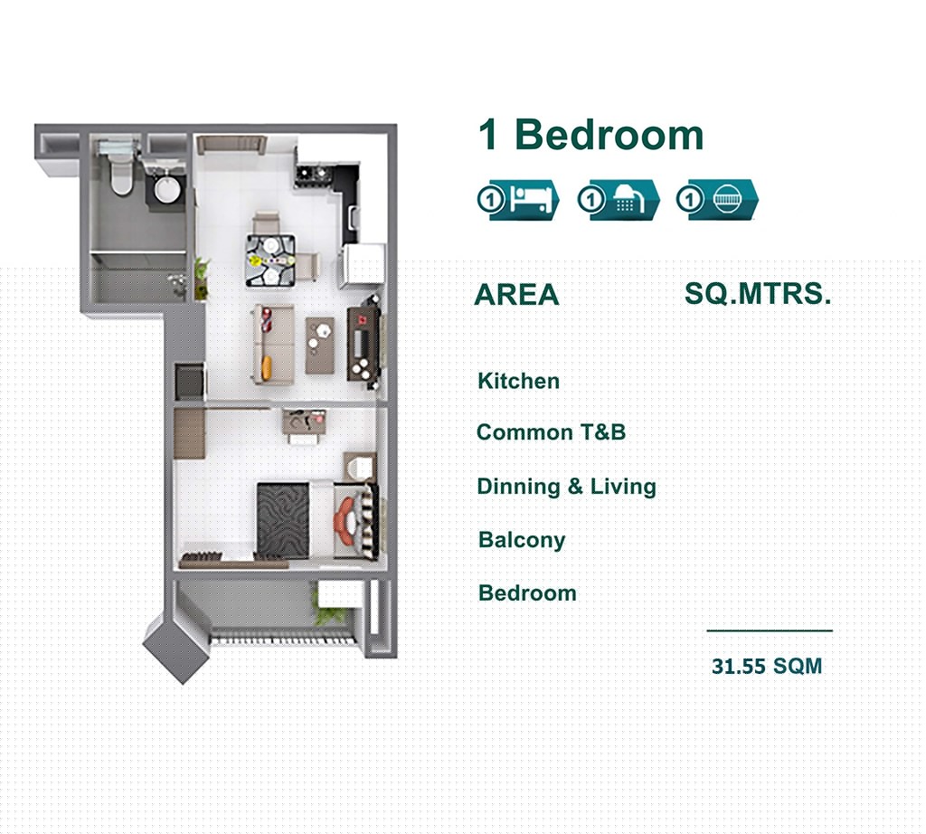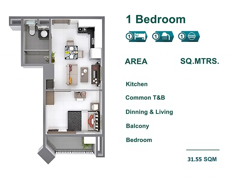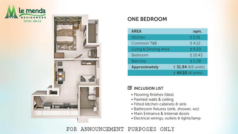 Example: A 1-bedroom unit with an area of 42 sqm is priced at ₱9,889,820.