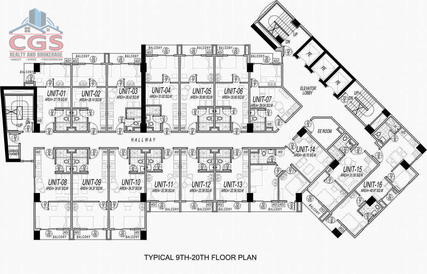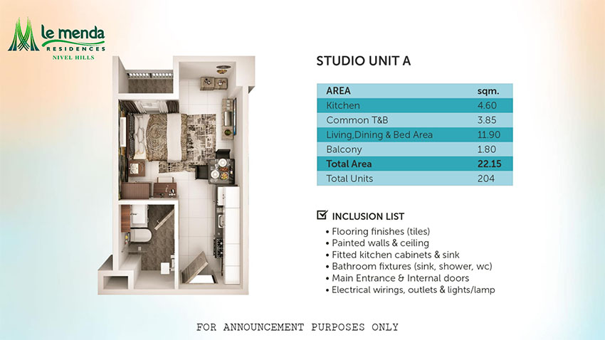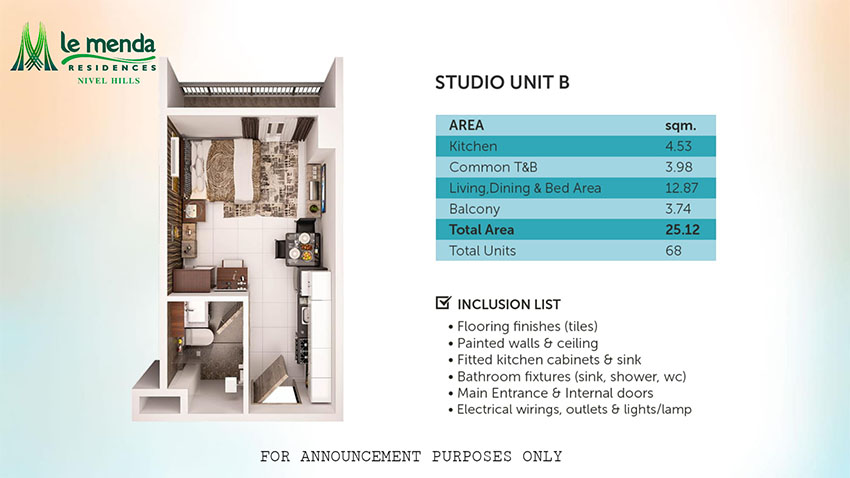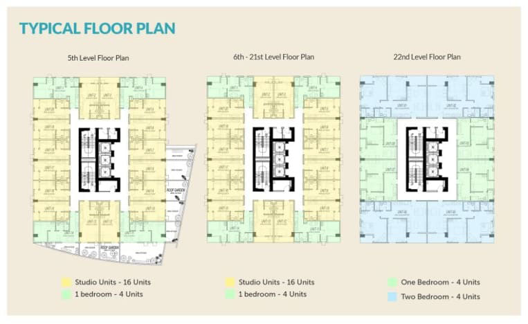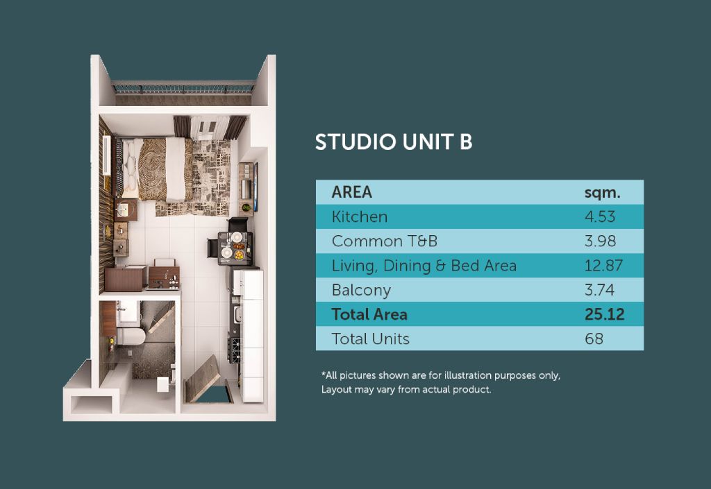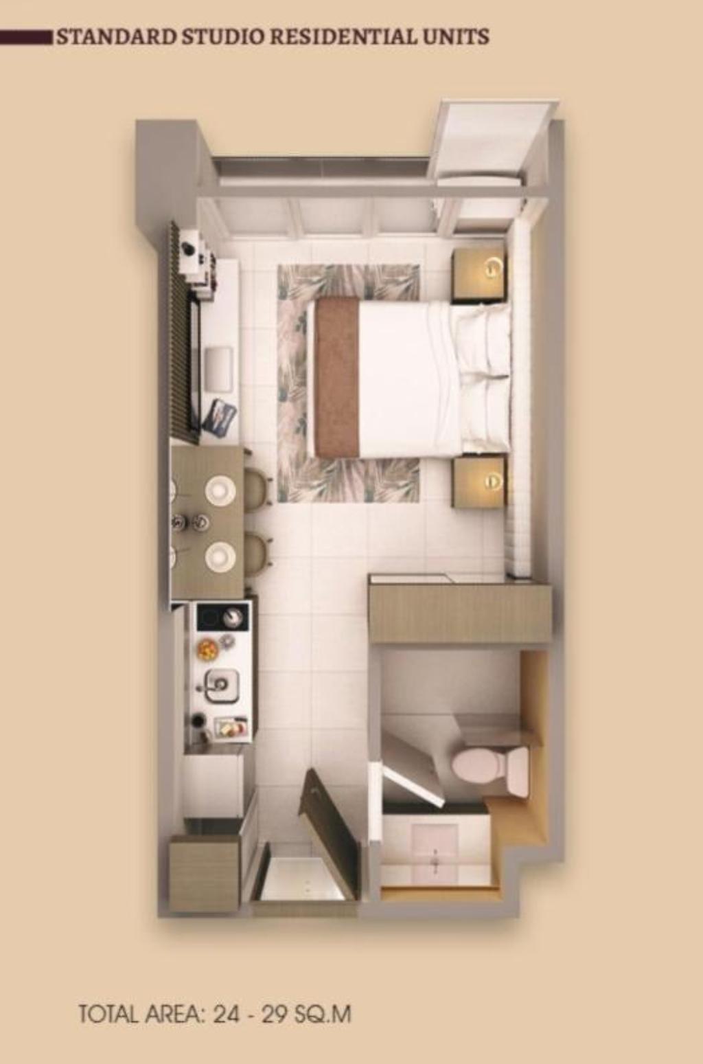 Example: A studio unit with an area of 24–29 sqm is priced at ₱5,499,390.