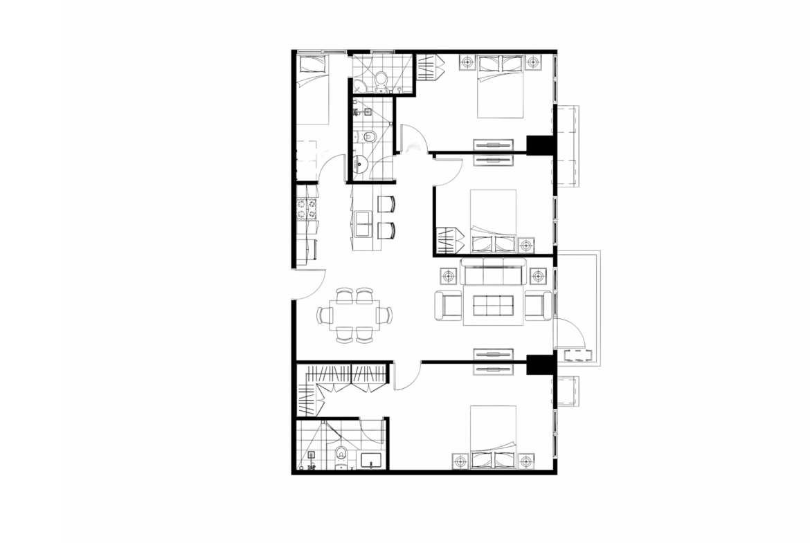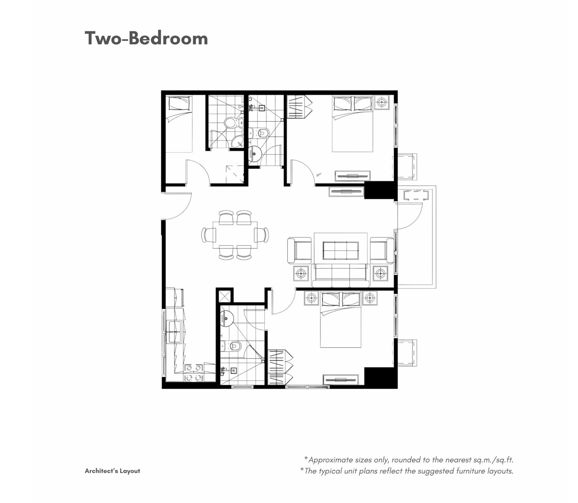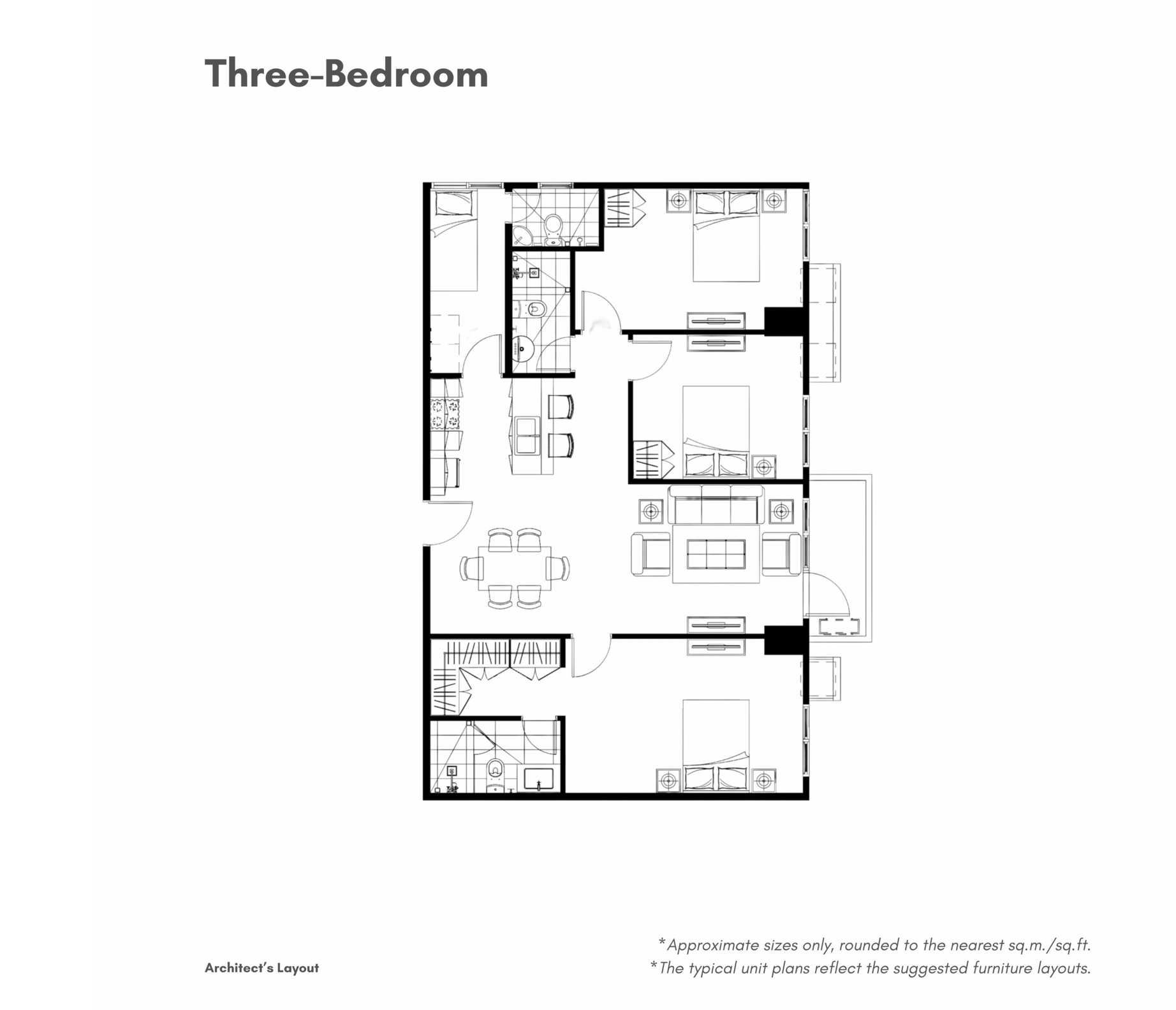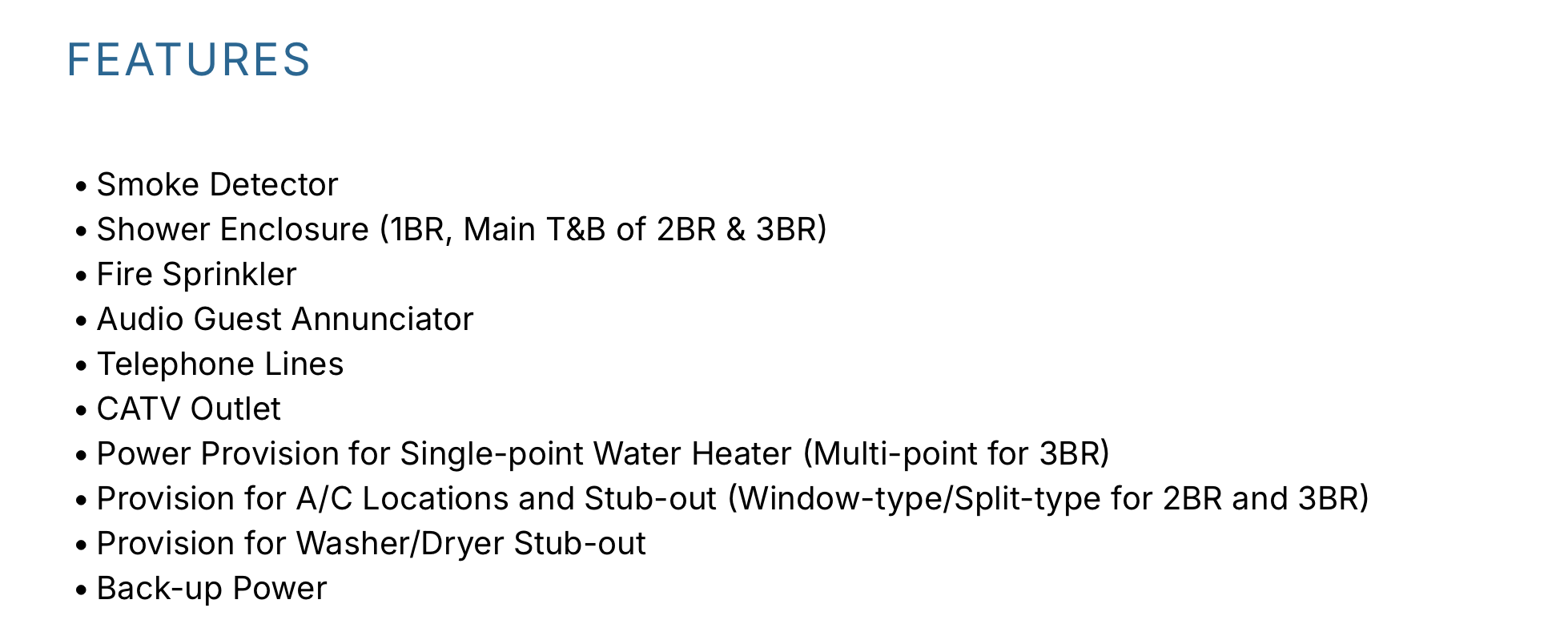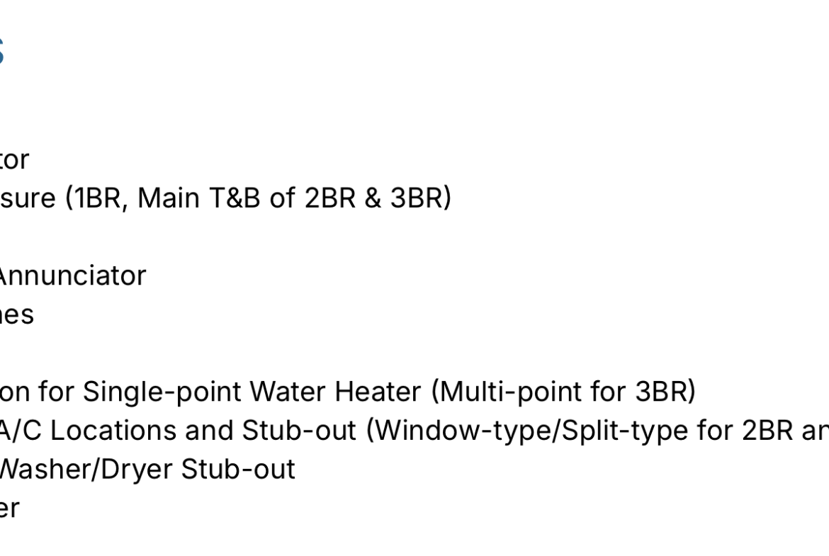 3. Provision for A/C units: window-type with louvers, or split-type with louvered ACCU location off the balcony and with refrigerant pipes installed.