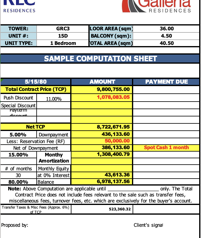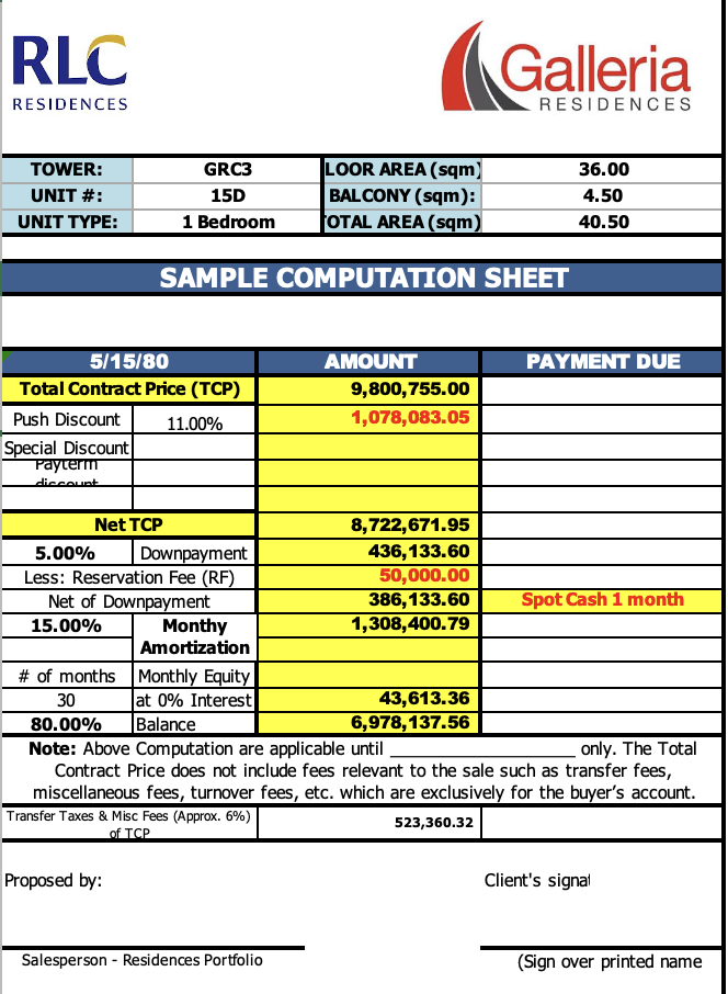 Transfer Taxes & Miscellaneous Fees (Approx. 6% of TCP): 523,360.32 PHP