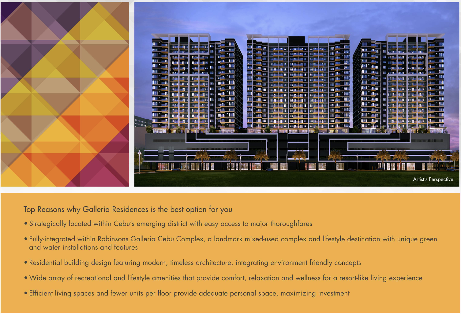 2. Best Location Within the Estate Tower 3 is strategically positioned inside the Robinsons Galleria Cebu complex. Your client will enjoy easy access to: